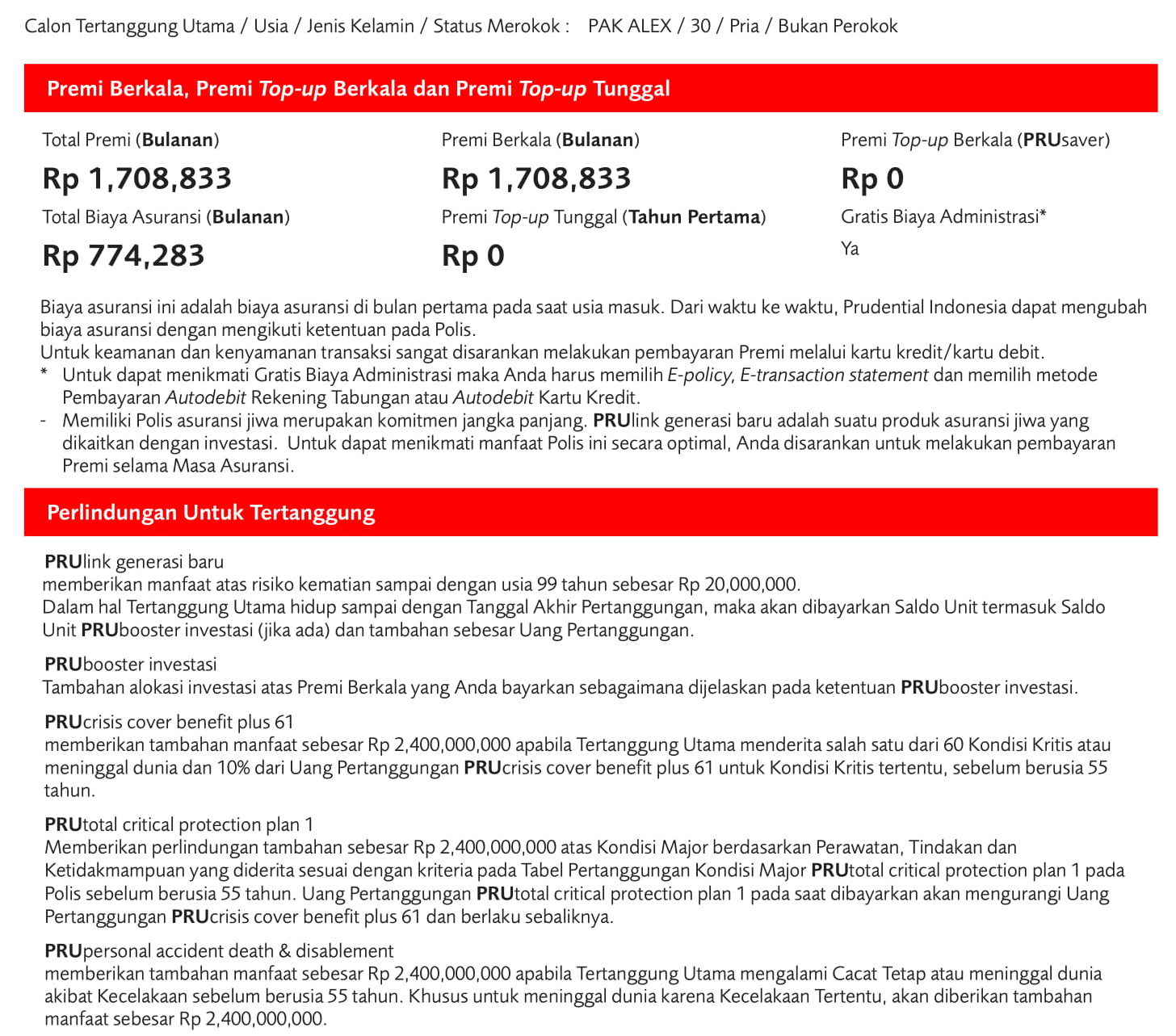 Dalam simulasi ini, Pak Alex cukup membayar biaya premi sebesar Rp.1.700.000 per bulan sebagai premi minimal, dan mendapatkan perlindungan sebagai berikut: