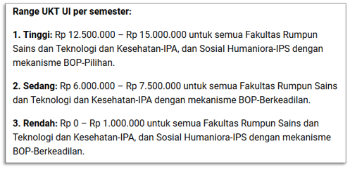 Untuk poin kedua, ‘berapa biaya kuliah saat ini’, berikut saya sajikan data biaya kuliah dari Universitas Indonesia yang diambil dari situs Kompas.com. Data ini sebagai gambaran saja supaya Mommy bisa memahami teknis perhitungannya.