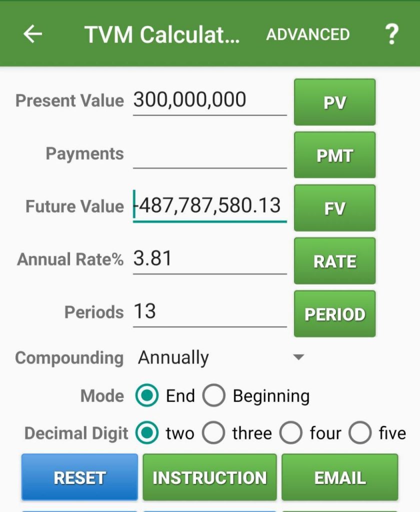 Saya masukan angka 300.000.000 (tanpa tanda titik) di baris Present Value, kemudian saya masukan inflasi 3.81 di baris Annual Rate%, angka 13 di Periods, Compounding saya ubah menjadi Annually, dan kemudian klik tombol FV (future value) dan ketemulah angka -487,787,580.13. Abaikan tanda minus-nya.