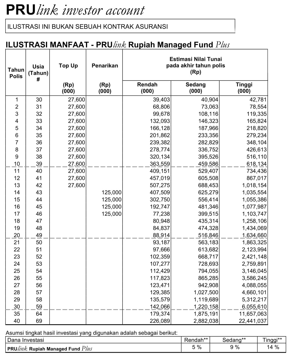 Berikut adalah contoh rencana Investasi menggunakan PIA, dimana setoran awal Rp.12.000.000, dan melakukan penyetoran sebesar Rp.2.300.000 per bulan secara rutin (atau kalau disetahunkan sama dengan Rp.27.600.000