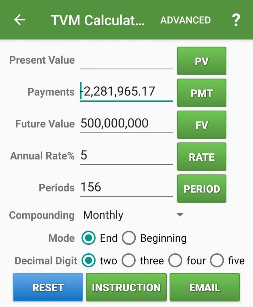 Selanjutnya, masukan angka 156 di baris Periods, artinya itu 13 x 12 bulan = 156 bulan. Dan terakhir ubah Compounding-nya menjadi Monthly. Klik tombol PMT (Payments) dan munculah angka -2,281.965.17 (abaikan tanda minusnya).
